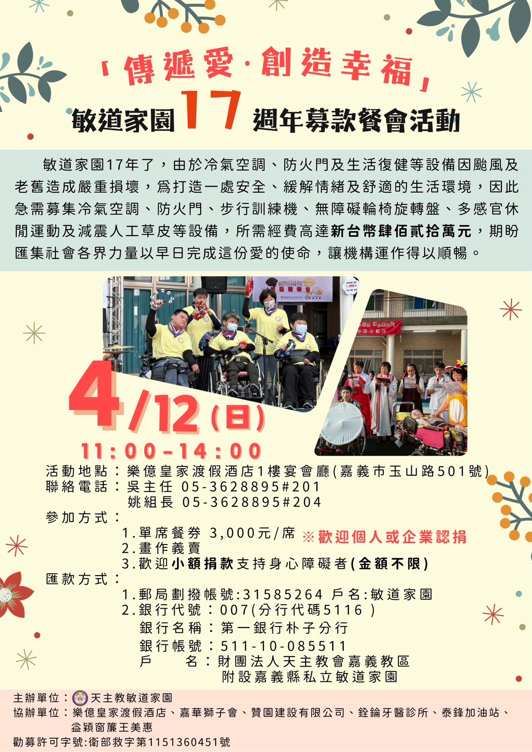 戶  名:財團法人天主教會嘉義教區附設嘉義縣私立敏道家園